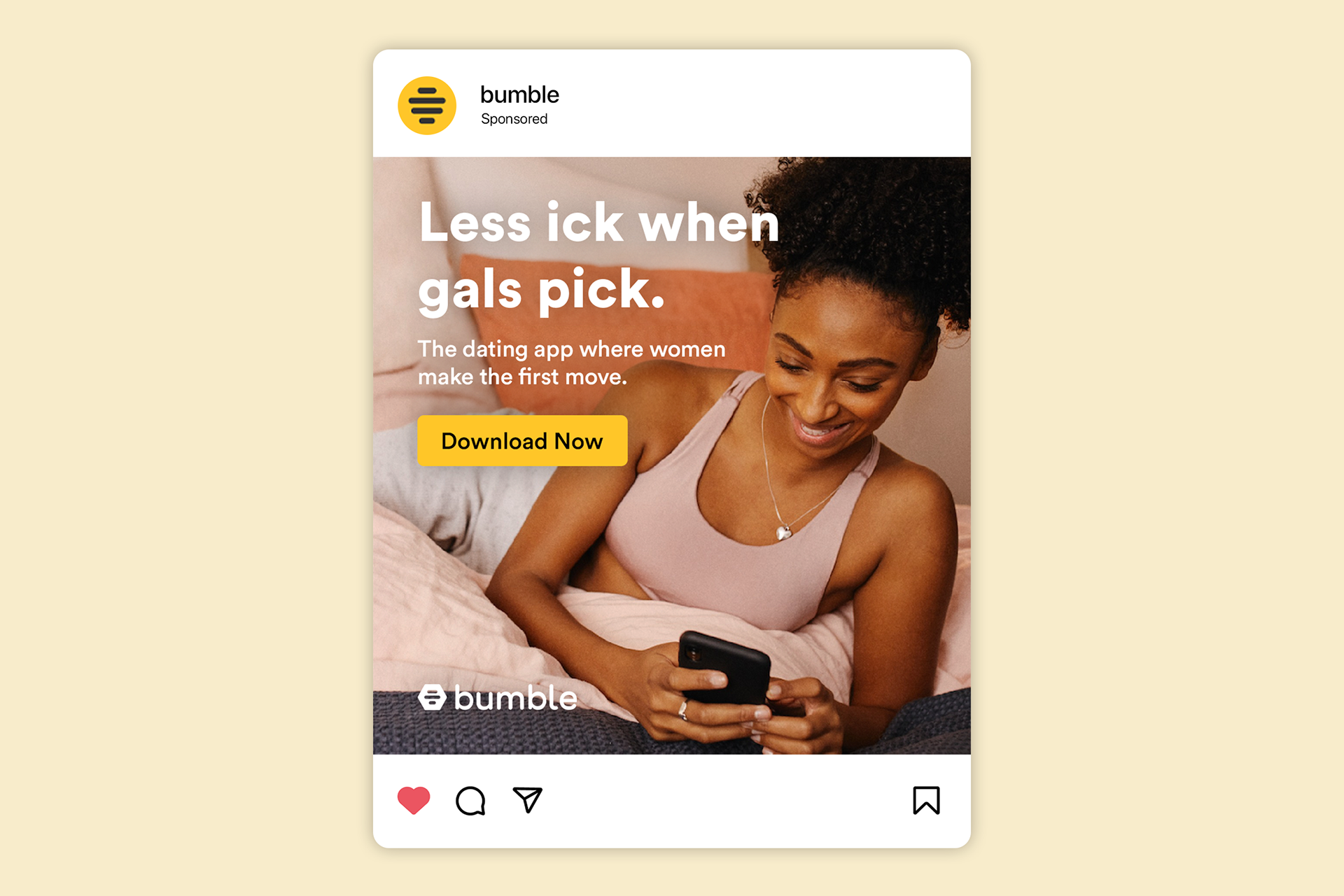 Bumble is a dating and social networking app. As part of our pitch, these mockups showcase various strategies to promote its unique value proposition—where women make the first move—using catchy copy and narrative-driven carousels.